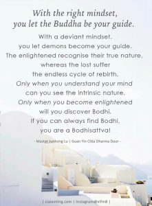 With the right mindset, you let the Buddha be your guide. With a deviant mindset, you let demons become your guide. The enlightened recognise their true nature, whereas the lost suffer the endless cycle of rebirth. Only when you understand your mind can you see the intrinsic nature. Only when you become enlightened will you discover Bodhi. If you can always find Bodhi, you are a Bodhisattva!
