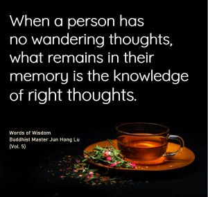 Words of Wisdom Words of Wisdom | Right Thoughts 14/11/2020 | Words of Wisdom Words of Wisdom < Words of Wisdom When a person has no wandering thoughts, what remains in their memory is the knowledge of right thoughts. 一个人没有杂念,记忆中, 就会留存正念的知识。 – Master Jun Hong Lu, Words of Wisdom Volume 5 < Words of Wisdom