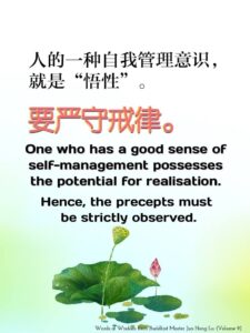 Words of Wisdom Words of Wisdom | Strictly Observe Precepts 15/02/2021 | Words of Wisdom Words of Wisdom < Words of Wisdom One who has a good sense of self-management possesses the potential for realisation. Hence, the precepts must be strictly observed. 人的一種自我管理意識, 就是“悟性”。 要嚴守戒律。 Master Jun Hong Lu, Words of Wisdom Volume 9 < Words of Wisdom