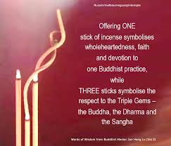 Offering one stick of incense symbolises wholeheartedness, faith and devotion to one Buddhist practice, while three sticks symbolise the respect to the Triple Gems – the Buddha, the Dharma and the Sangha.