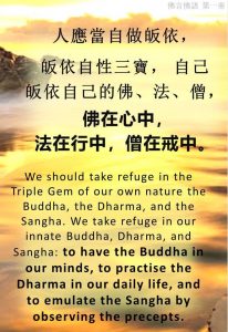 人应当自做皈依,皈依自性三宝, 自己皈依自己的佛、法、僧, 佛在心中,法在行中,僧在戒中。
