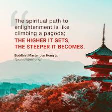 The spiritual path to enlightenment is like climbing a pagoda; the higher it gets, the steeper it becomes. This is why fewer and fewer practitioners are able to transcend beyond the human realm. Once we reach the top of the pagoda, however, we will have succeeded.