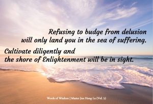 Refusing to budge from delusion will only land you in the sea of suffering. Cultivate diligently and the shore of Enlightenment will be in sight.