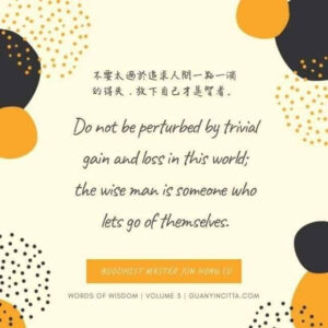 Words of Wisdom Words of Wisdom | The wise man is someone who lets go of themselves 26/05/2021 | Words of Wisdom Words of Wisdom < Words of Wisdom Do not be perturbed by trivial gain and loss in this world; the wise man is someone who lets go of themselves. 不要太过于追求人间一点一滴的得失,放下自己才是智者。 – Master Jun Hong Lu, Words of Wisdom Volume 3 < Words of Wisdom