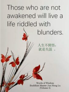 Words of Wisdom Words of Wisdom | Those Not Awakened 14/11/2020 | Words of Wisdom Words of Wisdom < Words of Wisdom Those who are not awakened will live a life riddled with blunders. 人生不开悟,就是失误 。 – Master Jun Hong Lu, Words of Wisdom Volume 5 < Words of Wisdom
