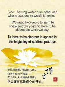 Slow-flowing water runs deep ; one who is cautious in words is noble. We need two years to learn to speak but ten years to learn to be discreet in what we say. To learn to be discreet in speech is the beginning of spiritual practice.