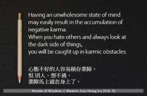 Having an unwholesome state of mind may easily result in the accumulation of negative karma. When you hate others and always look at the dark side of things, you will be caught up in karmic obstacles.