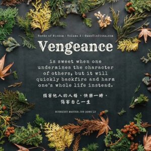 Words of Wisdom Words of Wisdom | Vengeance 02/03/2021 | Words of Wisdom Words of Wisdom < Words of Wisdom Vengeance is sweet when one undermines the character of others, but it will quickly backfire and harm one’s whole life instead. 损害他人的人格,快乐一时,伤害自己一生。 – Master Jun Hong Lu, Words of Wisdom Volume 3 < Words of Wisdom