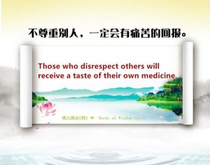 Words of Wisdom | Disrespect Published on September 7, 2020 Those who disrespect others will receive a taste of their own medicine. 不尊重别人,一定会有痛苦的回报。 Master Jun Hong Lu, Words of Wisdom Volume 4