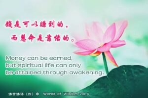 Words of Wisdom | Spiritual Life Published on September 2, 2020 Money can be earned, but spiritual life can only be attained through awakening. 钱是可以赚到的,而慧命是靠悟的。 Master Jun Hong Lu, Words of Wisdom Volume 4