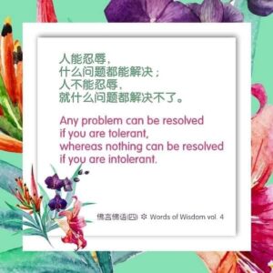 Words of Wisdom | Tolerant Published on September 7, 2020 Any problem can be resolved if you are tolerant, whereas nothing can be resolved if you are intolerant. 人能忍辱,什么问题都能解决; 人不能忍辱,就什么问题都解决不了。 Master Jun Hong Lu, Words of Wisdom Volume 4