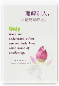 Words of Wisdom | Understanding Others Published on September 8, 2020 Only when we understand others can we truly have some sense of awakening. 理解别人,才能感动自己。 – Master Jun Hong Lu, Words of Wisdom Volume 6