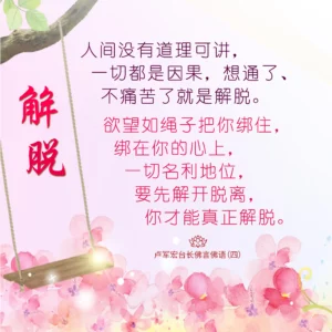 人间没有道理可讲,一切都是因果, 想通了、不痛苦了就是解脱。欲望如绳子把你绑住,绑在你的心上, 一切名利地位, 要先解开脱离,你才能真正解脱。