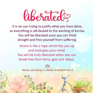 It is no use trying to justify what you have done, as everything is attributed to the working of karma. You will be liberated once you can think straight and free yourself from suffering. Desire is like a rope which ties you up and entangles your mind. You will be truly liberated when you can break free from fame, gain and status.